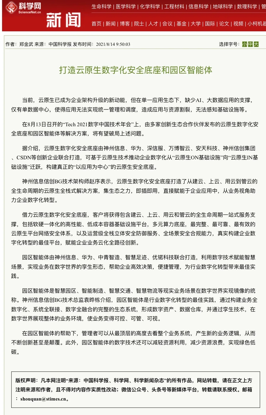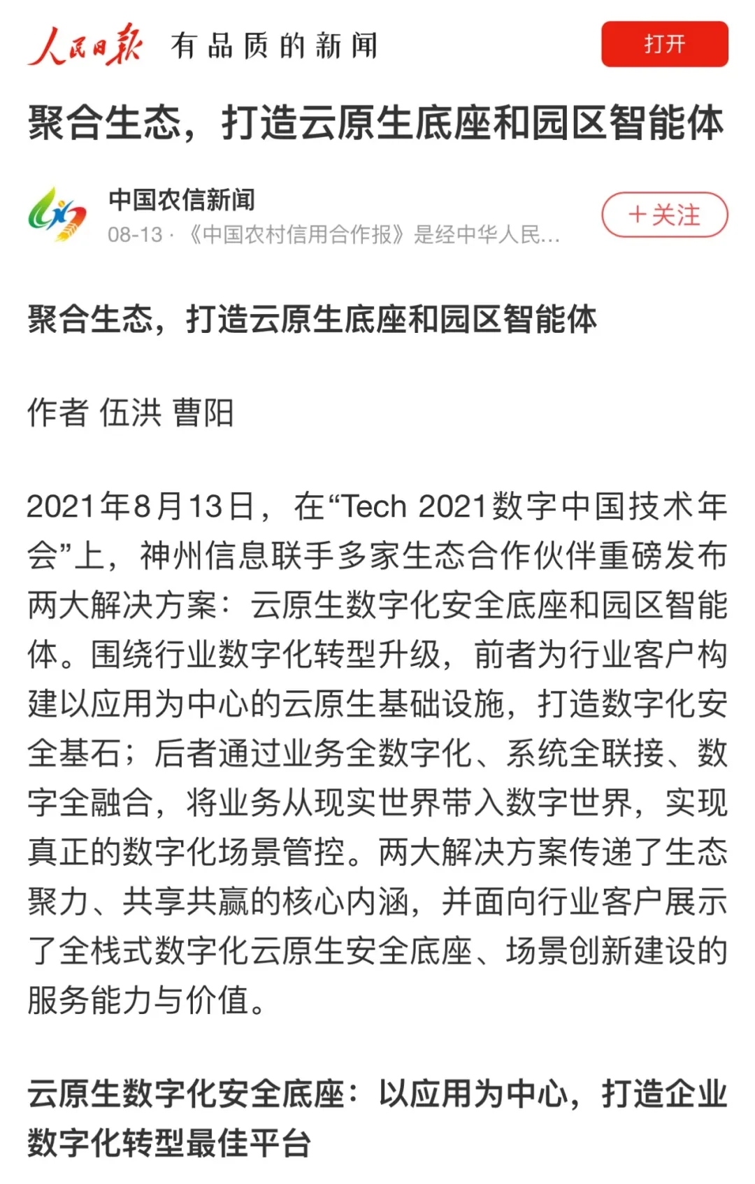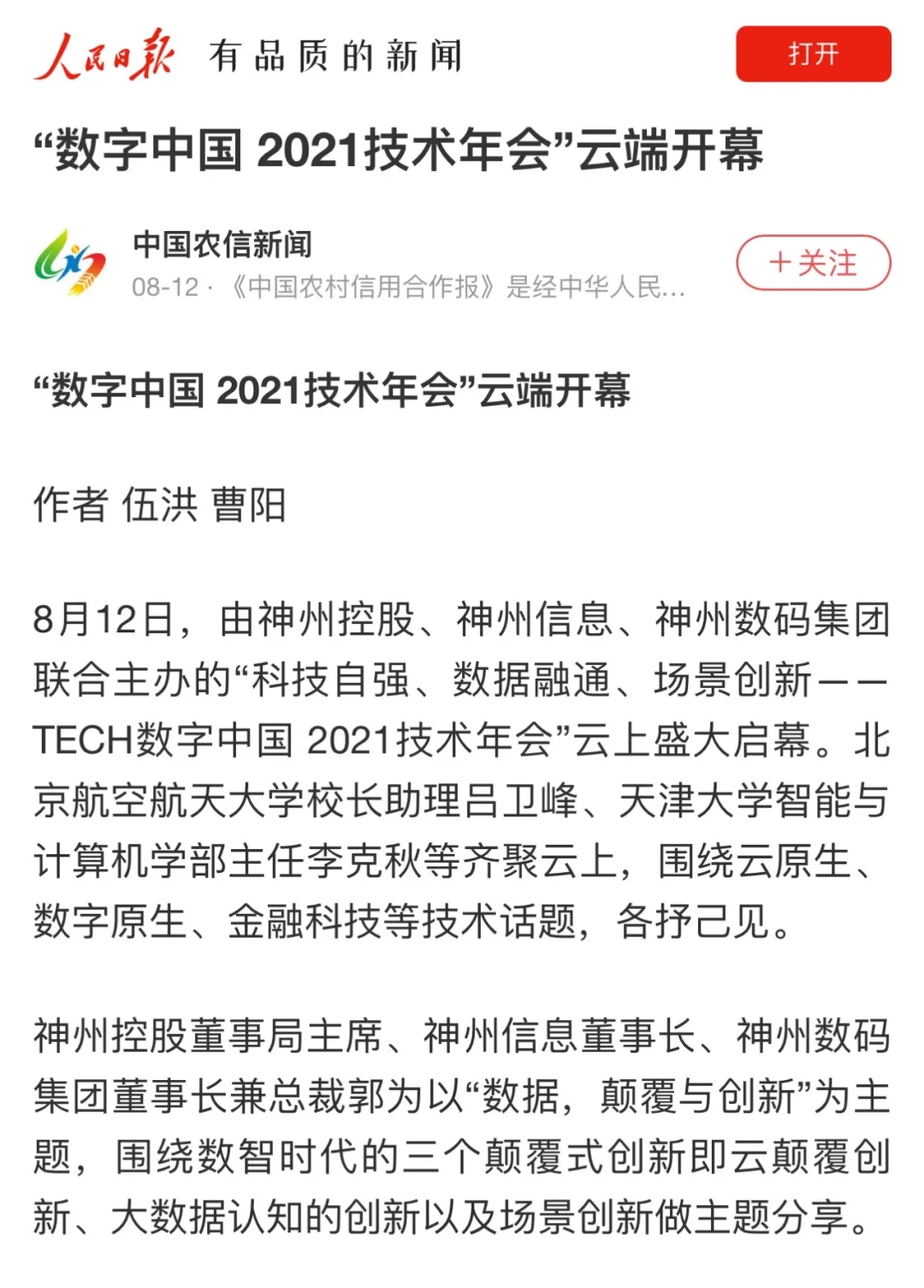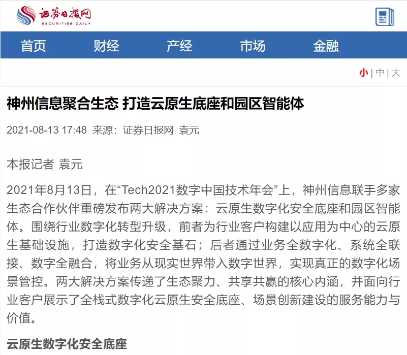 8月12日,由神州控股、神州信息、kaiyun.com集团联合主办的“科技自强、数据融通、场景创新——TECH数字中国 2021技术年会”云上盛大启幕,发布神州信创云、ModelB@nk5.0、金融超脑Sm@rtFSB、云原生数字化安全底座、园区智能体等重磅产品,国内各大权威、影响力媒体多角度多频次对盛况进行报道!